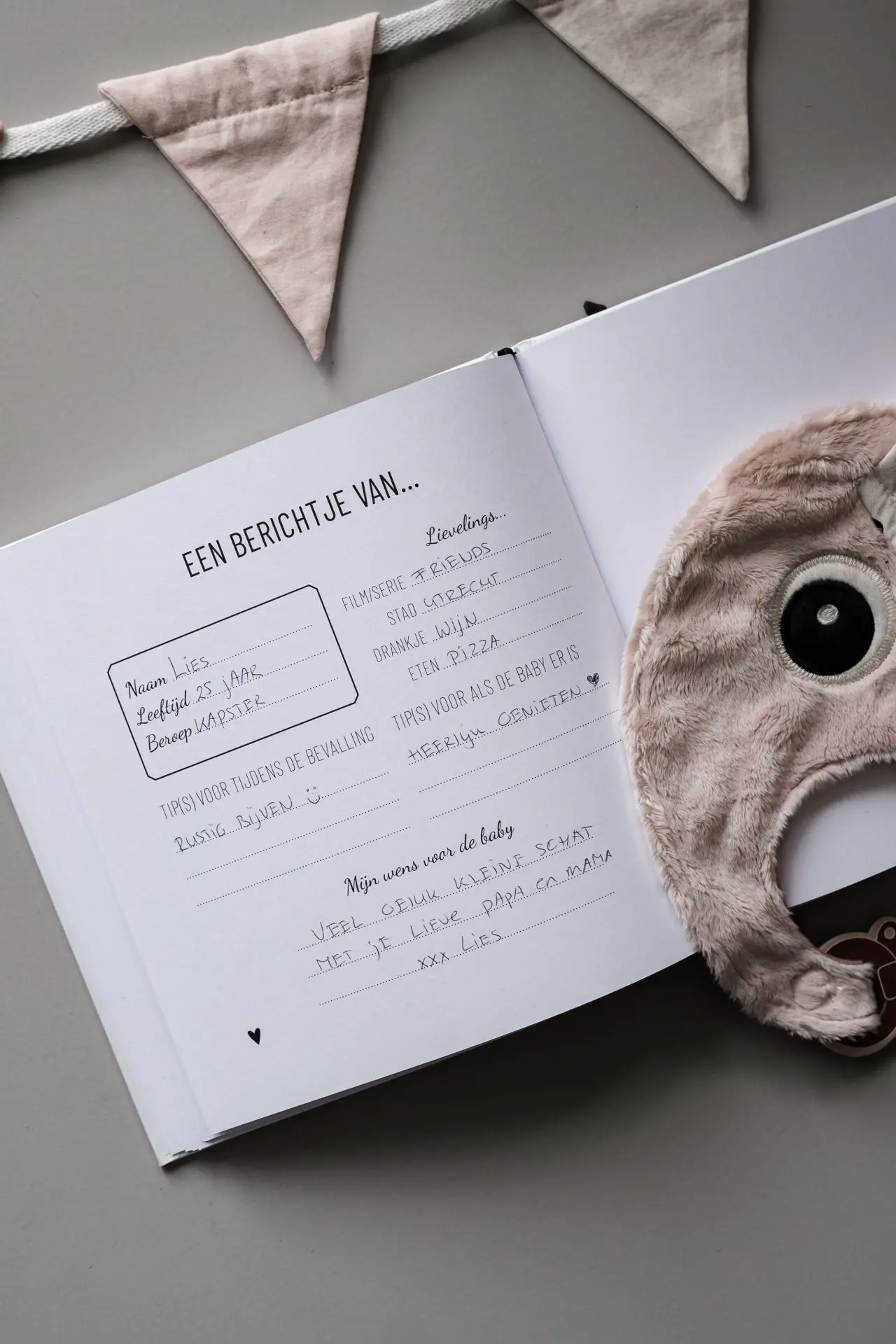 Nadat de voorspellingen zijn gedaan schrijven de gasten allemaal iets over zichzelf. Zoals de naam, leeftijd en beroep. Ook kunnen ze hun lievelings- serie/stad/drankje en eten delen. Ze kunnen tips voor tijdens de bevalling opschrijven en tips meegeven voor als de baby er straks is. Als laatste schrijven ze een wens op voor de baby.